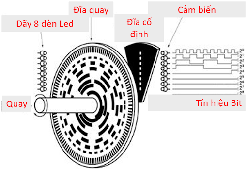 Đây là loại Encoder sử dụng đĩa theo mã nhị phân hoặc mã gray. Có kết cấu gồm những bộ phận: