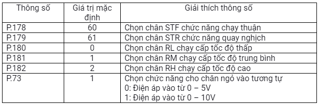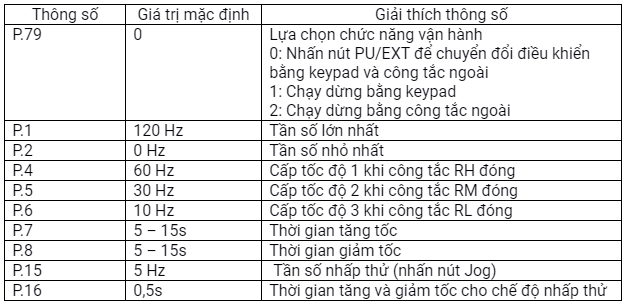 P.79 = 2 chọn chức năng chạy dừng bằng công tắc ngoài. (Lưu ý để chạy bằng biến trở thì các chân RH, RM, RL phải tắt)